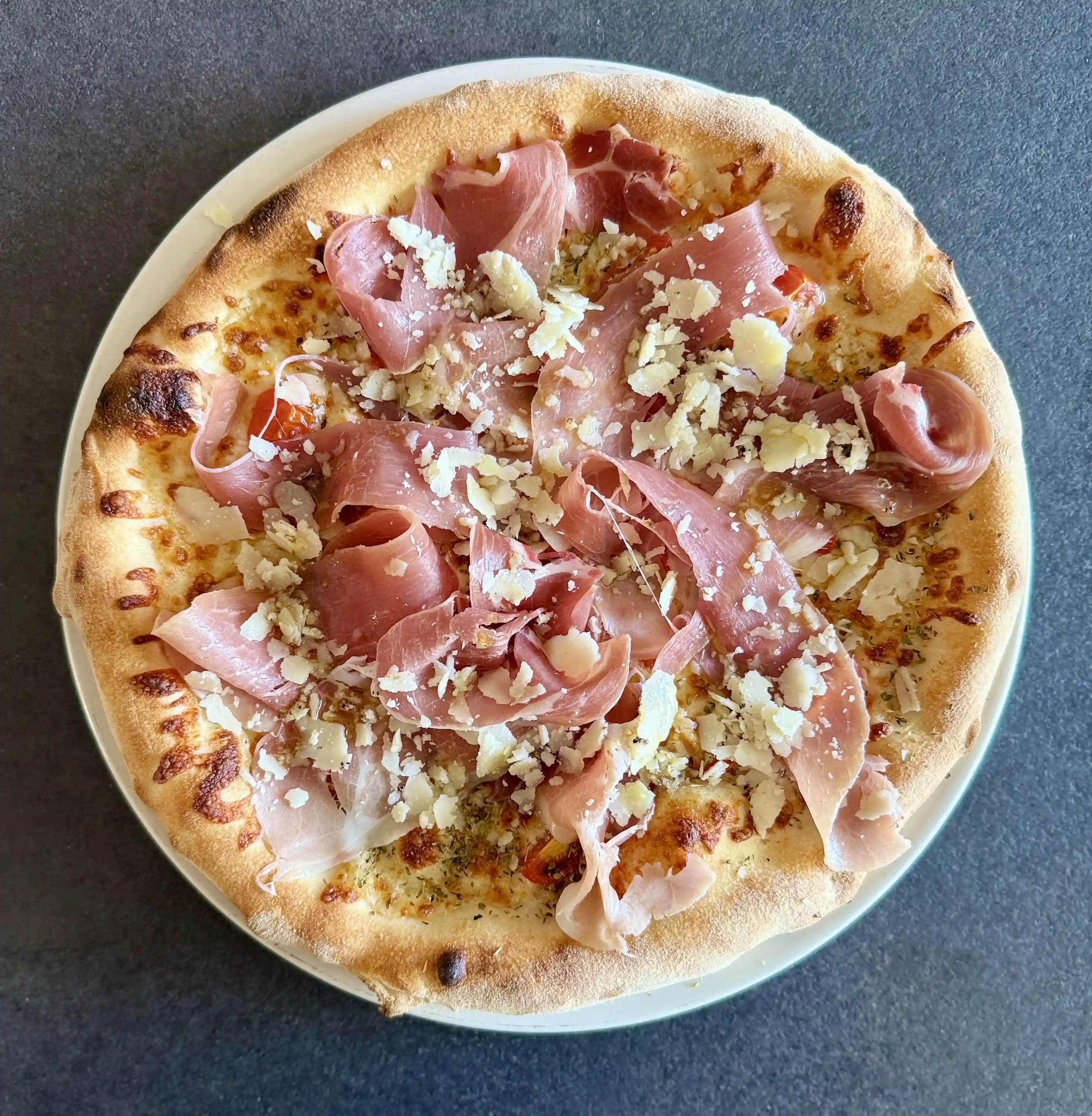 Tomate, champignons frais, jambon de parme, mozzarella